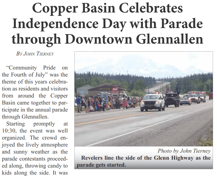 Join the community for the 4th of July in Glennallen! Each year there is a morning fun run, followed by a parade down the main street (Glenn Highway). After the parade, make your way to Pioneer Park (baseball fields behind the public library) for the annual Lions Club Salmon Bake and family activities.