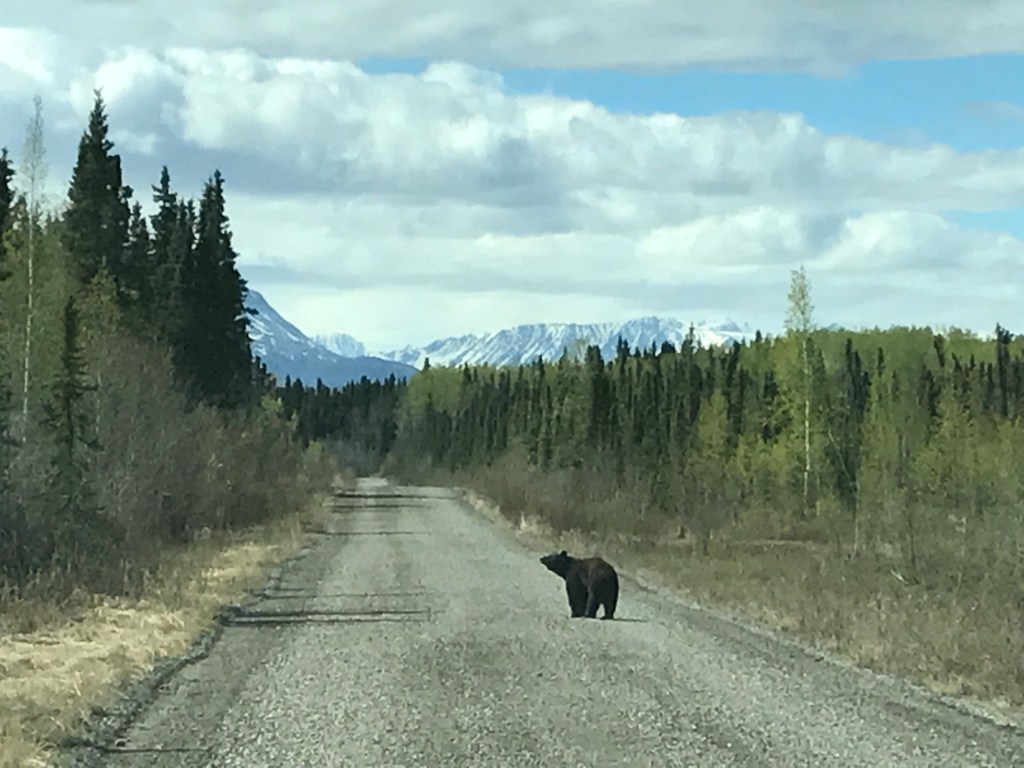 The road is not easily traveled – the pavement stops at Chitina. After crossing the bridge over the Copper River, a somewhat level gravel road winds 60 miles to McCarthy, with travel speeds topping out at 40 mph. But the journey is worth the destination. Photographed, a black bear stops to take in its surroundings on the “highway”.