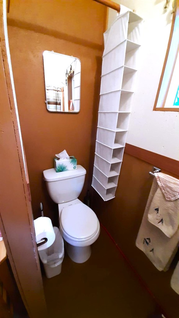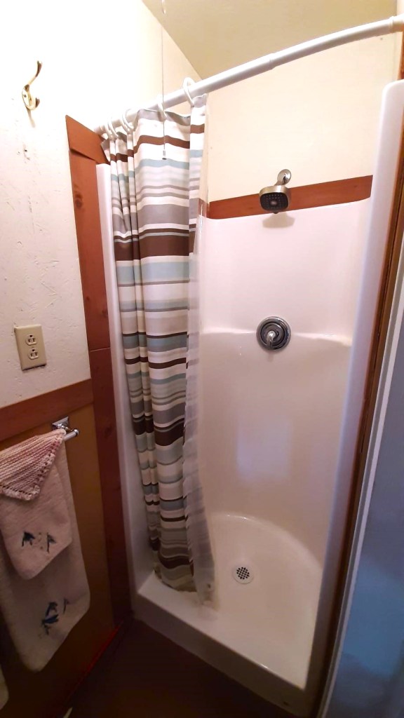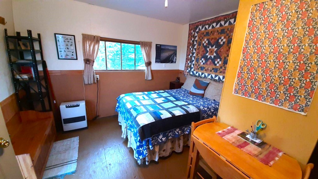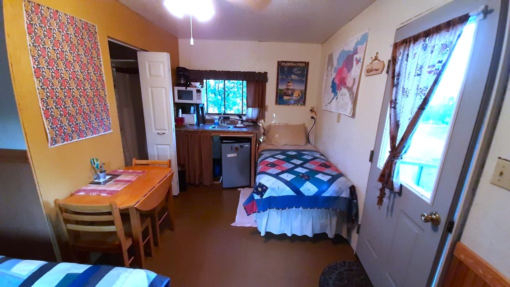 The cabin is small (16′ x 12′) with space for three guests (full and twin bed.)